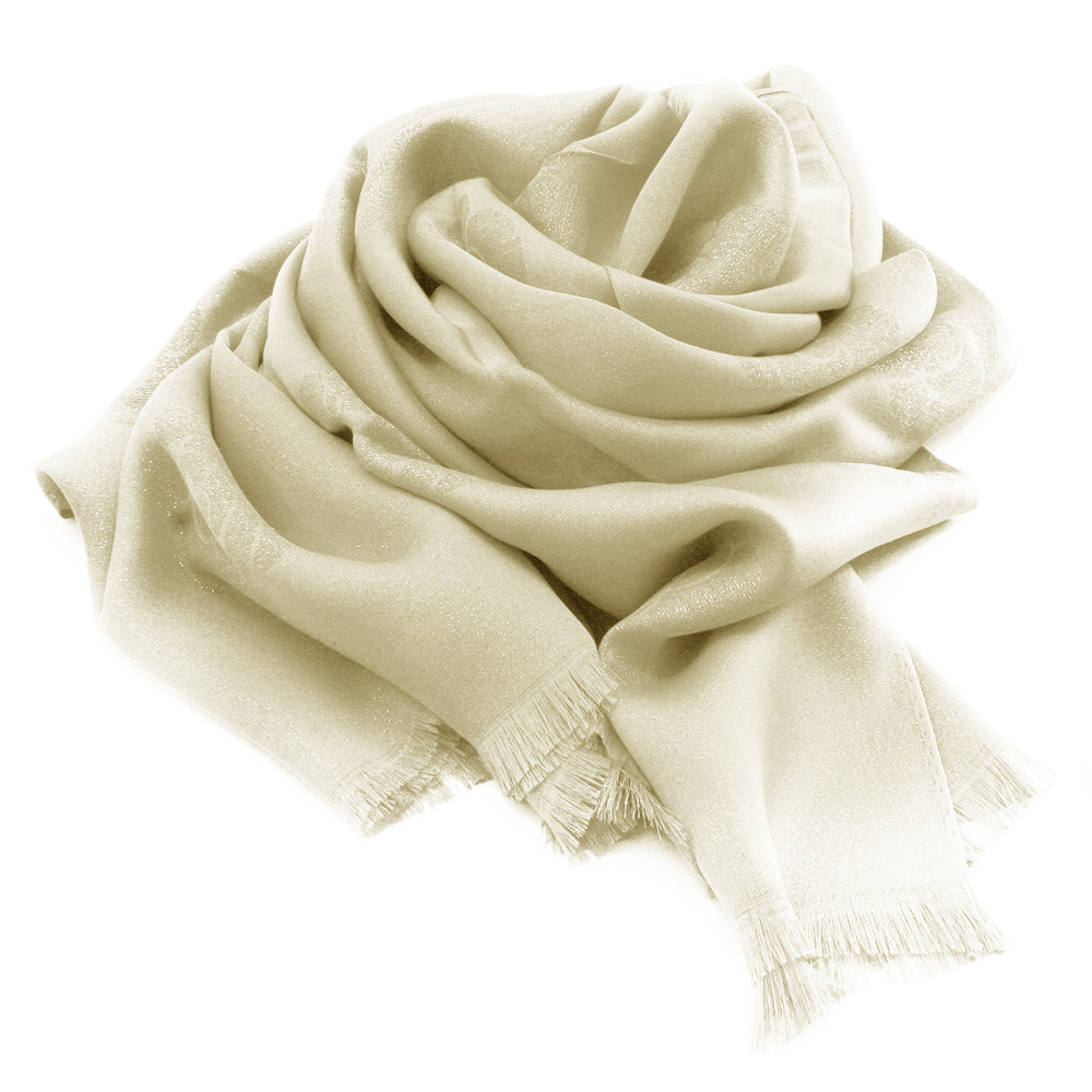 Jemná dámska šatka so zlatou nitkou a rozstrapkaným okrajom je ľahká a príjemná na omak. Slúži ako ideálny módny doplnok.