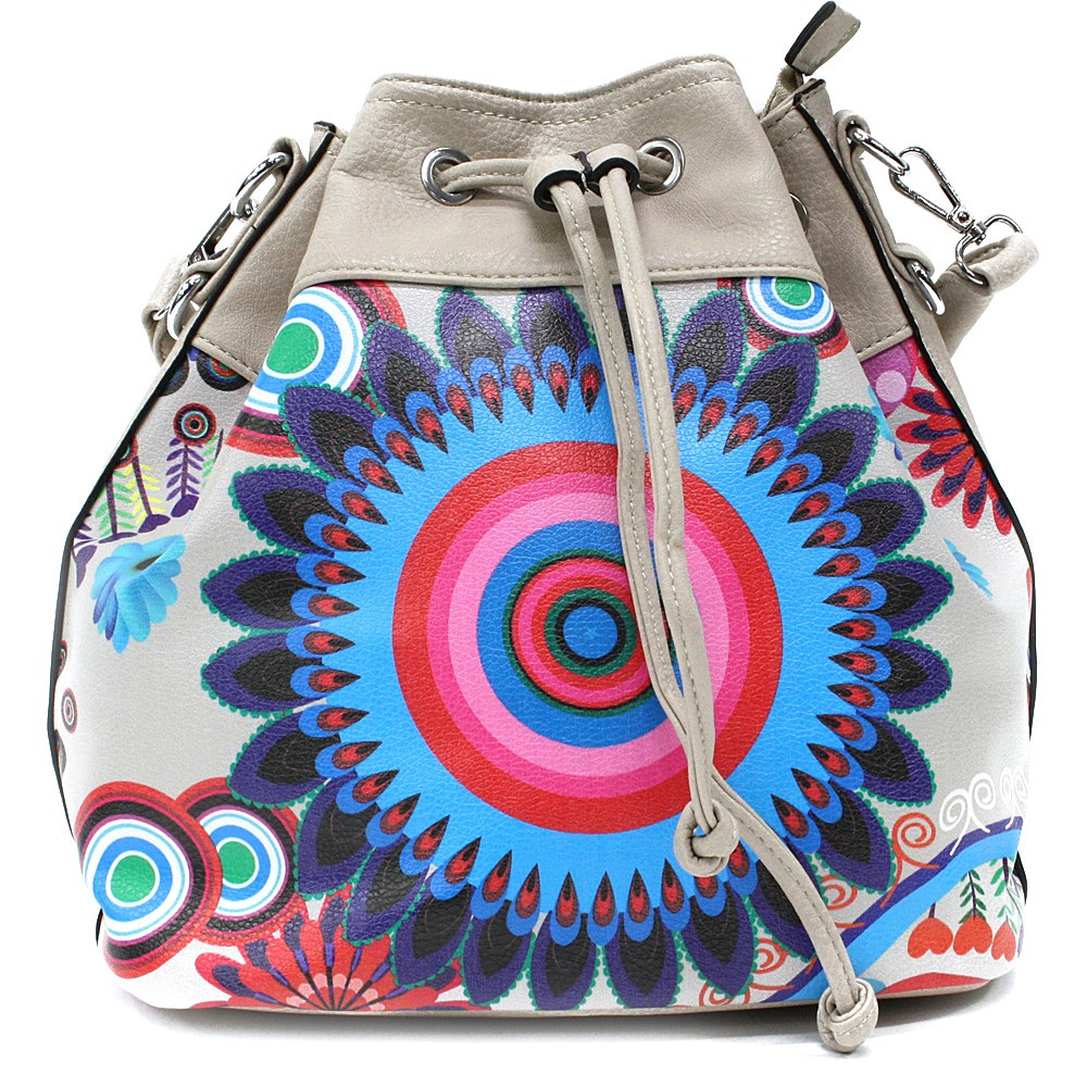 Středně velká kabelka ve tvaru vaku se stahovací šňůrkou má hlavní kapsa chráněnou zipem a stahovací šňůrkou. Taška má jeden kratší a jeden delší odnímatelný popruh. Přední strana je výrazně barevná.
