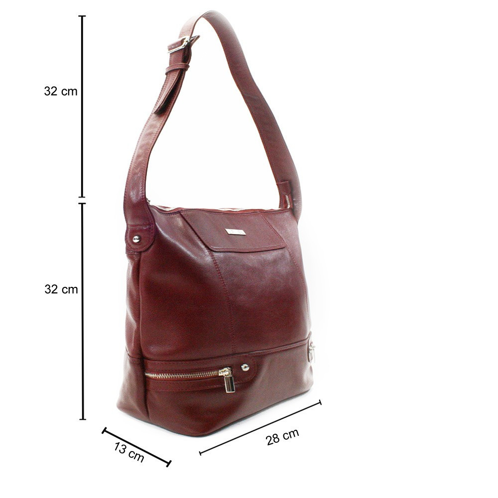 Dámska moderná kabelka je vyrobená z kvalitnej kože a má hlavný priestor krytý zipsom. Vnútri sa nachádza zipsová prepážka, malé zipsové vrecko a vrecko na mobil. Na vonkajšej zadnej strane je umiestnené zipsové vrecko. Na bokoch sú malé funkčné vrecká. Popruh cez rameno je pevný, nastaviteľný do cca 80 cm. Súčasťou kabelky je malé zrkadlo v koženom obale.