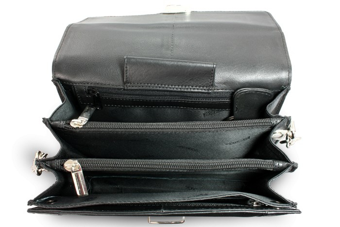 Čierna etue obsahuje 3 separácie oddelené zipsovými vreckami, sklápací register s 2 separáciami na doklady, 4 vrecká pre kreditné karty, 2 zipsové vrecká, odopínateľný krúžok na kľúče vonkajšie zipsové vrecko, odopínacie pútko na zápästie, odopínací remeň cez rameno. x 13 cm.Materiál NAPPA, farba čierna.