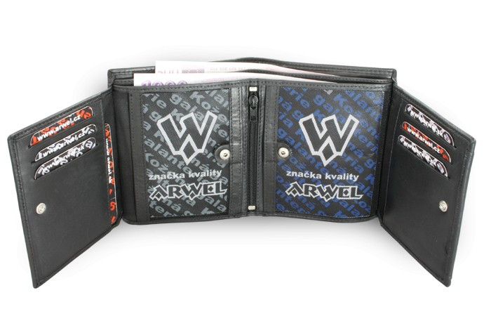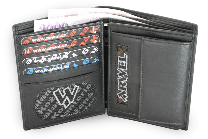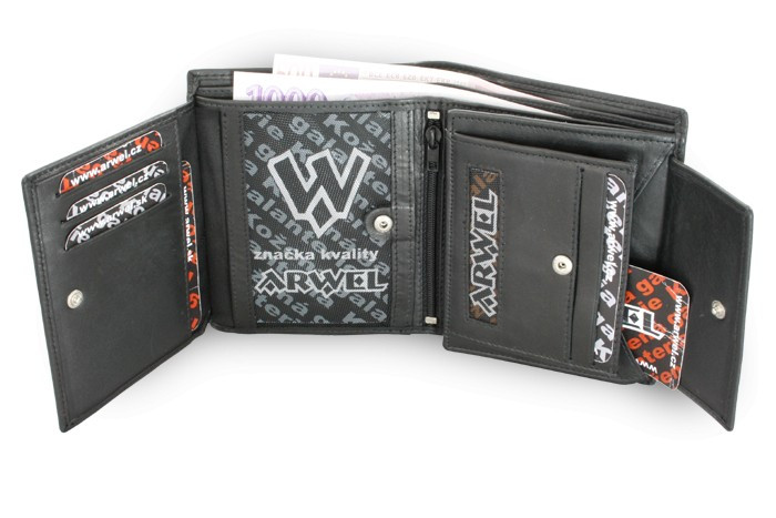 Pánska kožená peňaženka Arwel v čiernej farbe. Peňaženka je rozkladacia a obsahuje 2 priehradky na bankovky, vrecko na mince, 12 vreciek na kreditné karty, 2 vnútorné a 2 priehľadné vrecká veľkosti osobných dokladov a jedno zipsové vrecko. Základný rozmer 10,5 x 12,5 cm. Materiál NAPPA, farba čierna .