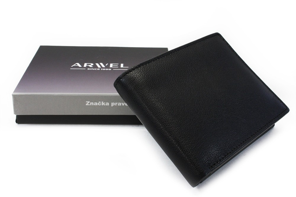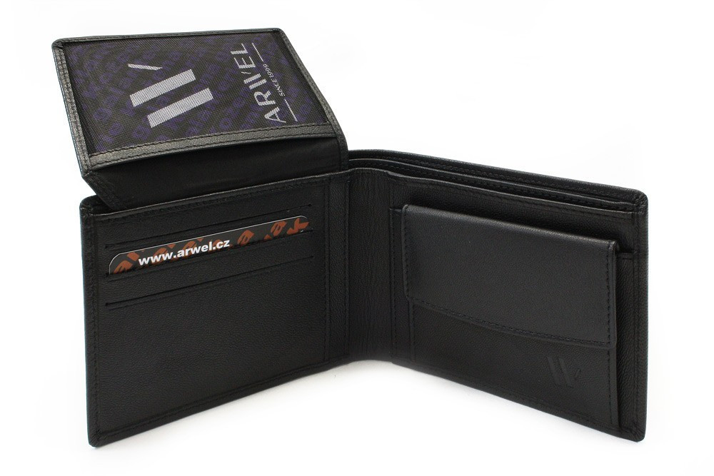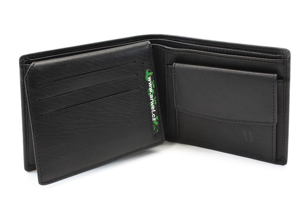 Klasická pánska kožená peňaženka na šírku má 2 priehradky na bankovky a 1 poklopové vrecko na mince. Ďalej obsahuje 10 vreciek na kreditné karty a 1 priehľadné vrecko veľkosti osobných dokladov.