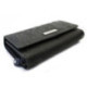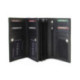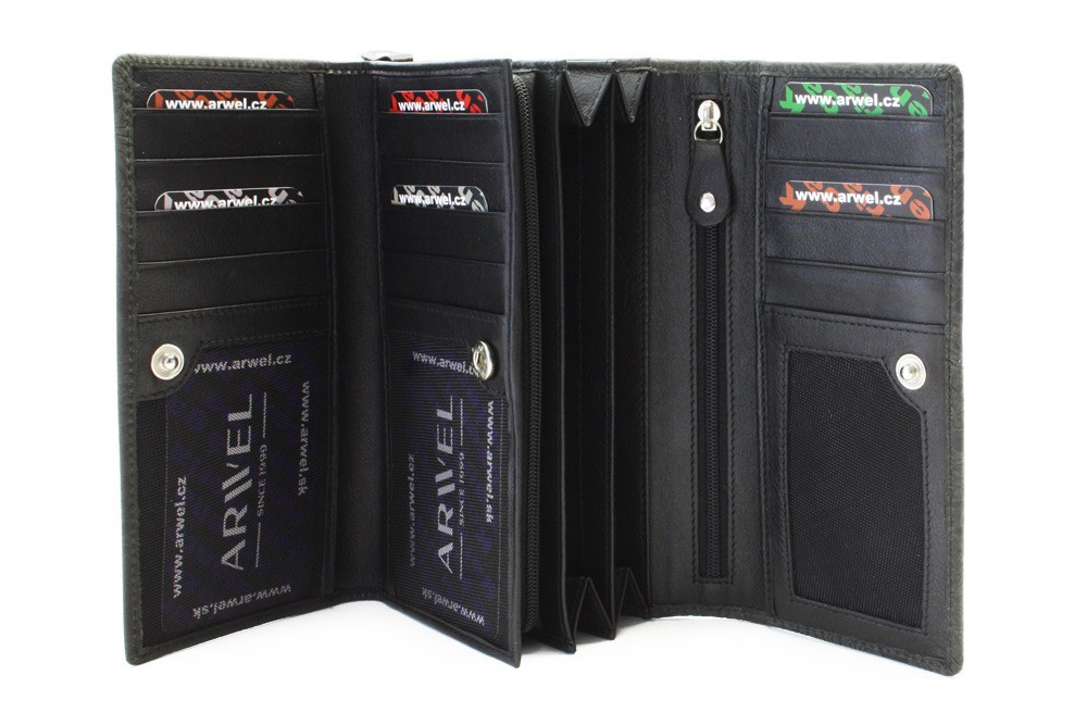 Podlhovastá, bohato vybavená, kožená klopnová peňaženka ponúka 2 priehradky na bankovky, jeden veľký delený zipsový mincovník, 12 priehradiek na kreditné karty, vizitky či doklady, tri priehľadné okná na vkladanie fotiek a päť otvorených vnútorných vreciek. Na zadnej strane je zipsové vrecko. Peňaženka má zapínanie na poklop s ozdobným kovaním istenou cvokom. Šitie je vo farbe kože.