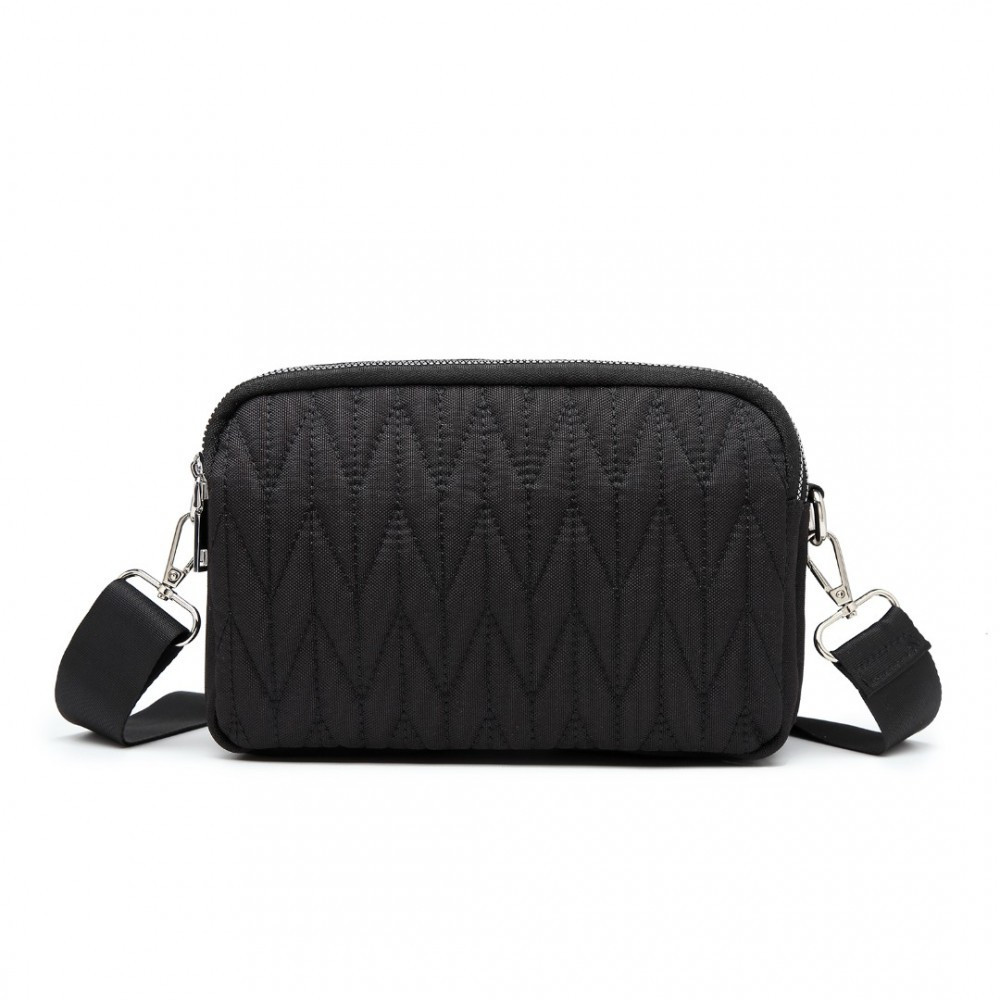 Trendy dámska crossbody kabelka s geometrickou výšivkou je obdĺžnikového tvaru. K dispozícii sú 3 hlavné vrecká uzatvárateľné zipsom. Na zadnej vonkajšej strane sa nachádza menšie zipsové vrecko. Popruh cez rameno je odnímateľný a nastaviteľný.