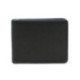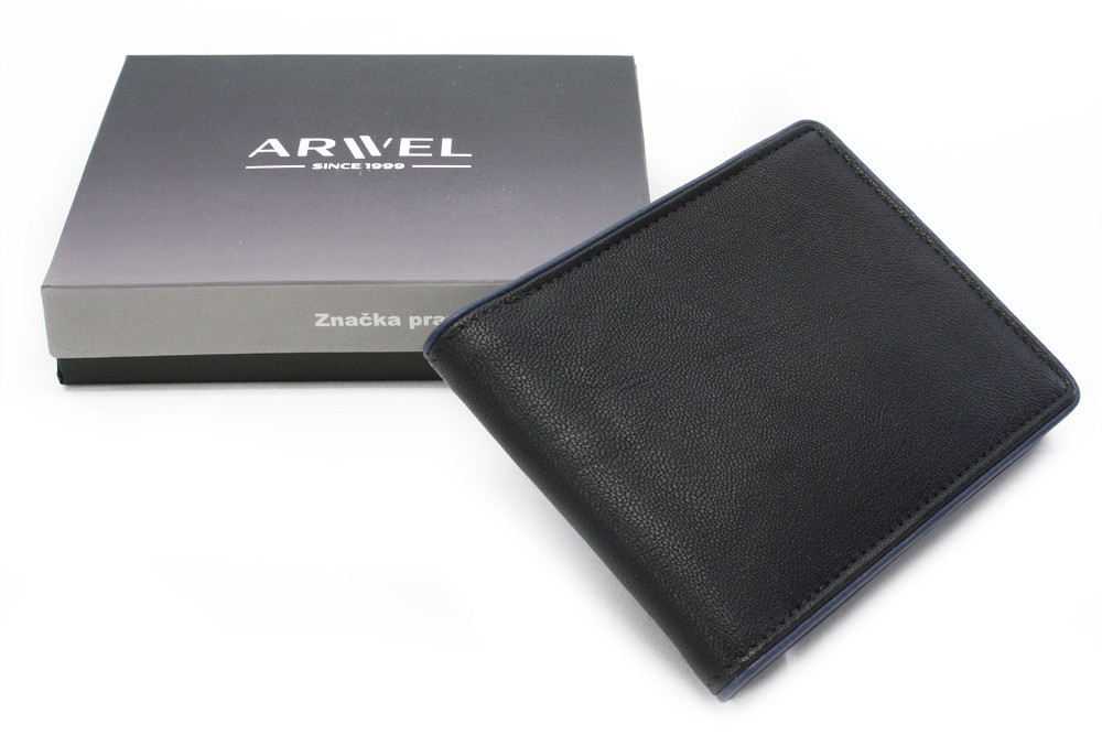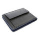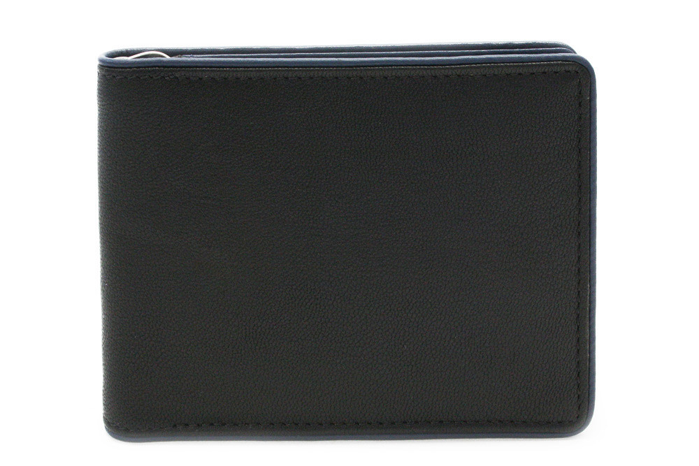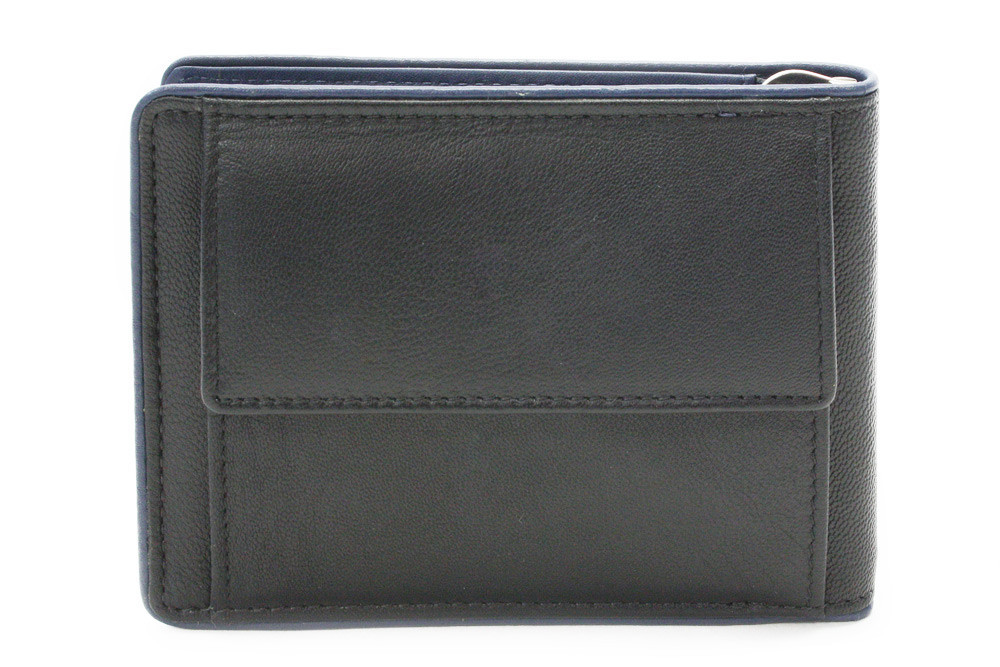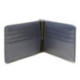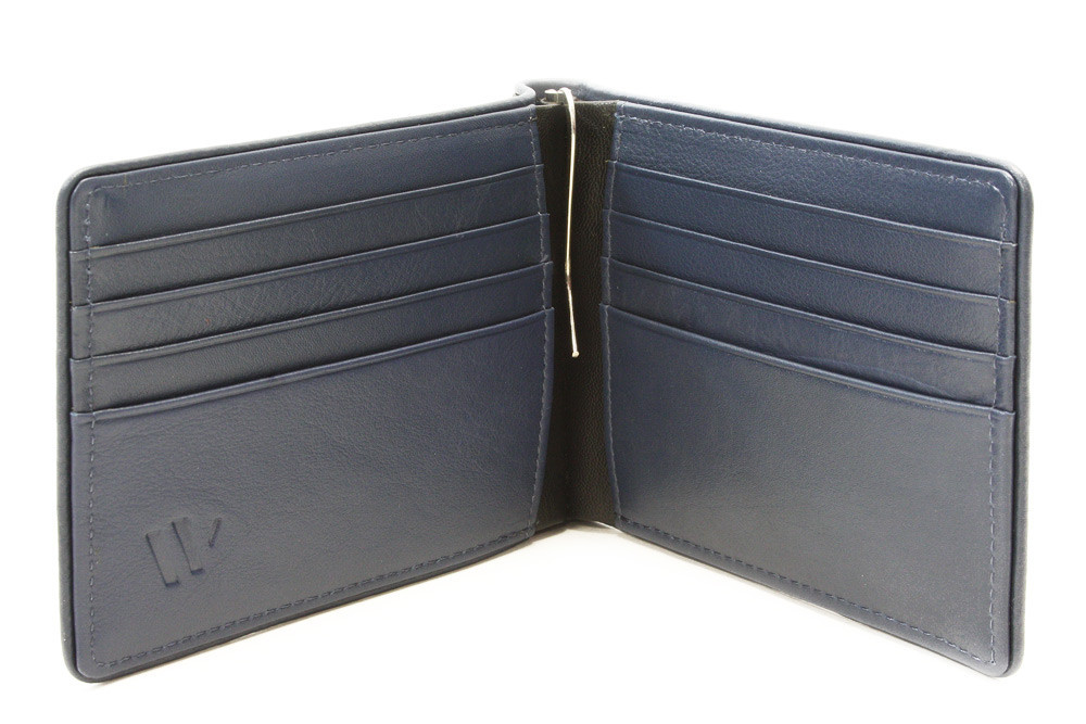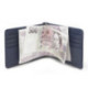 Pružina na uchytenie bankoviek, 8 vreciek na kreditné karty, 2 vnútorné vrecká a vonkajšie vrecko na mince. Šitie v modrej farbe.