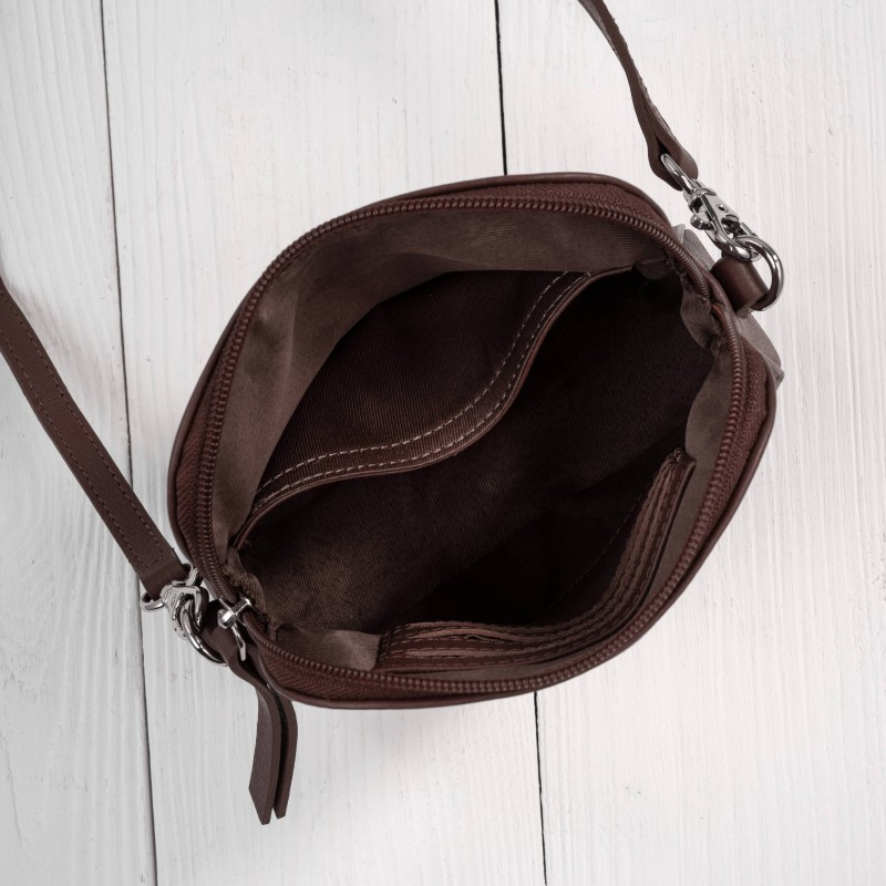 Malý dámsky crossbag z pravej kože v elegantnom hnedom odtieni predstavuje ideálne spojenie nadčasového designu, kompaktnej veľkosti a vysokej funkčnosti.