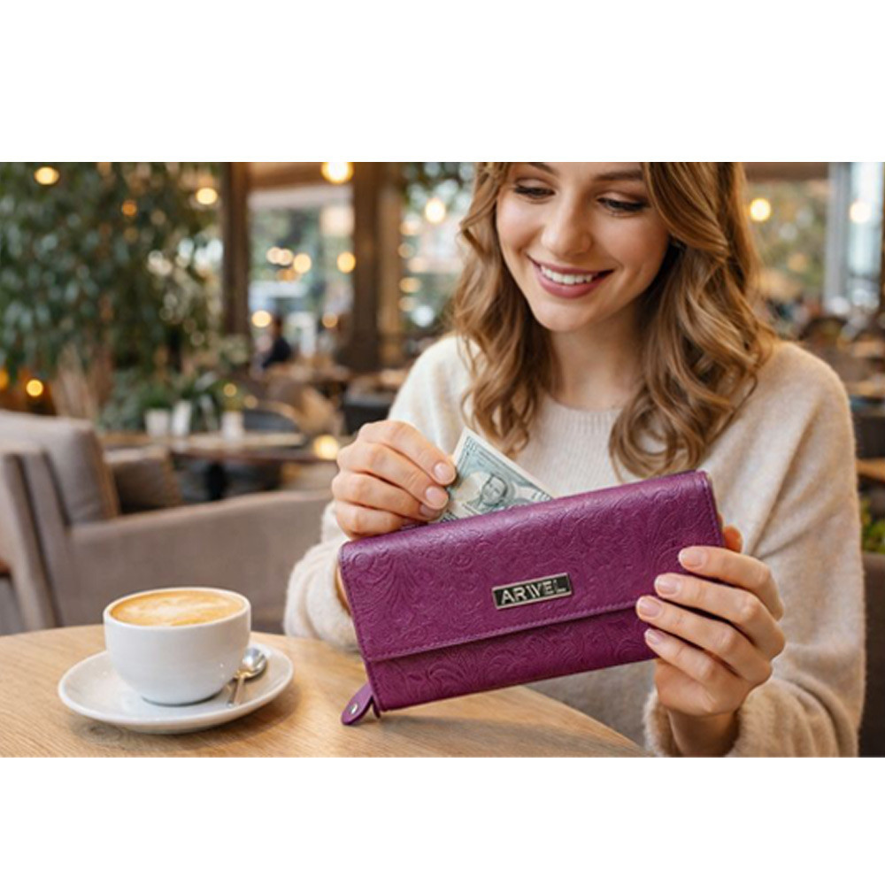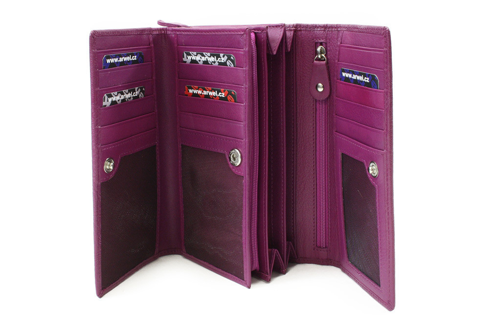Podlhovastá, bohato vybavená, kožená klopnová peňaženka ponúka 2 priehradky na bankovky, jeden veľký delený zipsový mincovník, 12 priehradiek na kreditné karty, vizitky či doklady, tri priehľadné okná na vkladanie fotiek a päť otvorených vnútorných vreciek. Na zadnej strane je zipsové vrecko. Peňaženka má zapínanie na poklop s ozdobným kovaním istenou cvokom. Šitie je vo farbe kože.