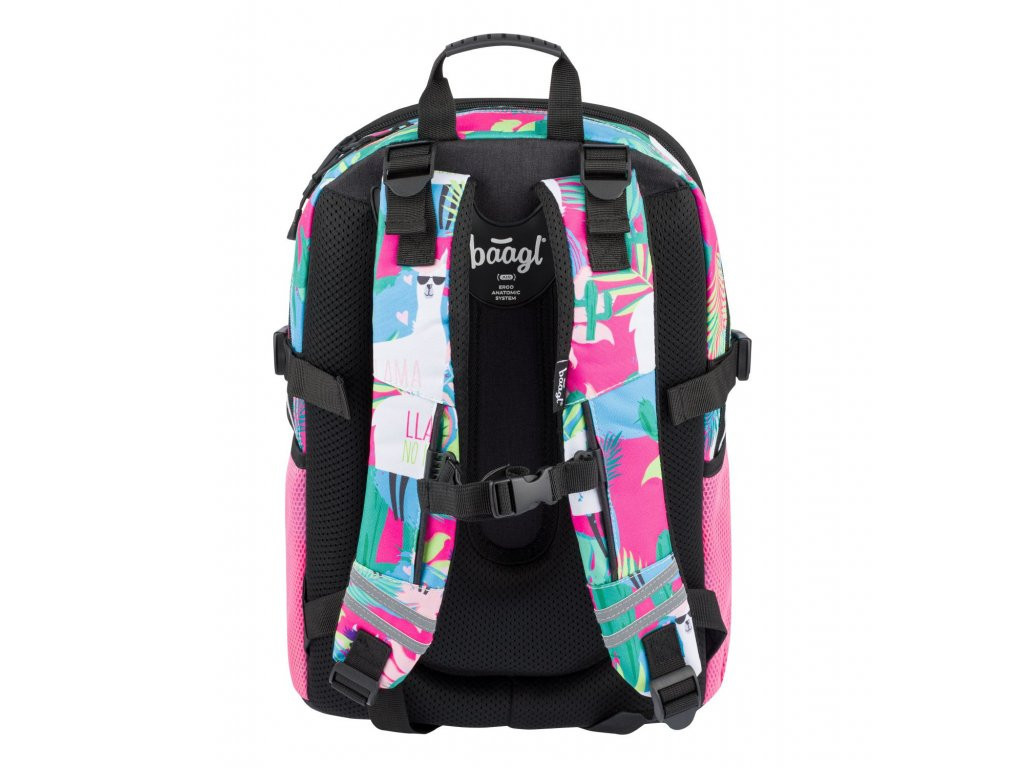 Vodeodolný zipsový dievčenský plecniak má tri samostatne uzatvárateľné oddelenia s vnútorným organizérom. Chrbát a popruhy sú anatomicky tvarované a polstrované, s nastaviteľným prsným popruhom. Po bokoch sú sieťové otvorené vrecká. Batoh má reflexné prvky pre väčšiu bezpečnosť a viditeľnosť školáka a je vybavený trendmi peňaženkou.