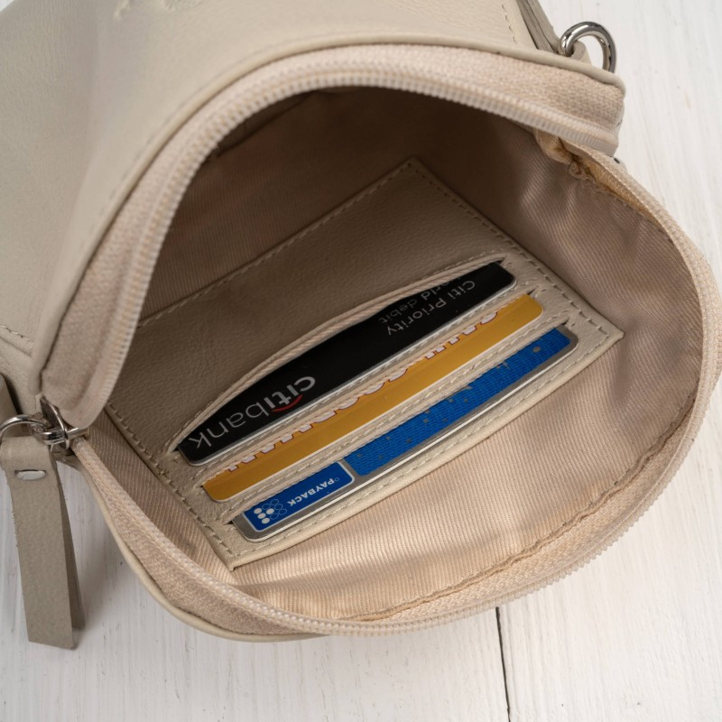 Malý dámsky crossbag z pravej kože v elegantnom smotanovom odtieni predstavuje ideálne spojenie nadčasového designu, kompaktnej veľkosti a vysokej funkčnosti.