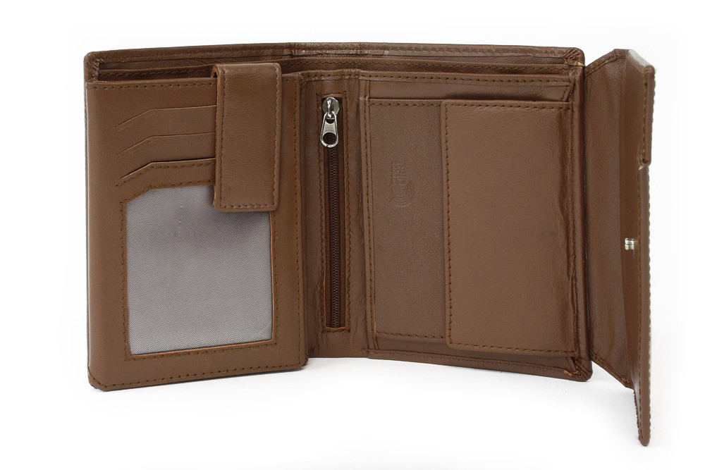 Bohato vybavená dámska peňaženka s netradičnou poklopom obsahuje dve vrecká na bankovky, jedno poklopové vrecko na mince, 10 priehradok na platobné karty či doklady istené zápinkou, 3 priehľadné okná a dve skryté vrecká. Na zadnej vonkajšej strane sa nachádza zipsové vrecko. Dodávame v darčekovej krabičke.