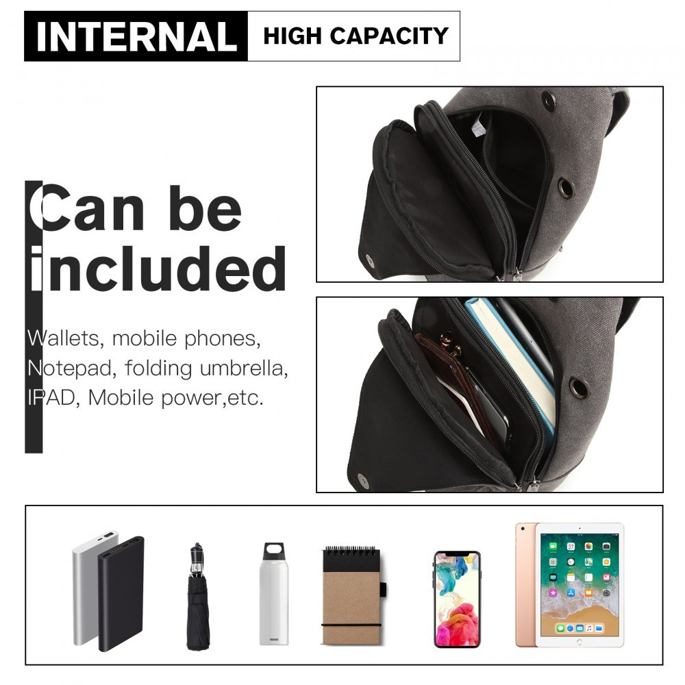 Športový batoh ideálny na výlet. Dve hlavné vrecká batohu sú zipsové, kryté poklopom na cvok, vo vnútri sa nachádza ďalšie malé zipsové vrecko. Z vonkajšej prednej strany sú tri kapsičky rôznej veľkosti. Na zadnej strane batohu je skryté vrecko na zips, ideálne pre cennejšie predmety. Ramenný popruh má zips uprostred, takže taška môže byť nosená cez rameno alebo ako batoh na chrbte.